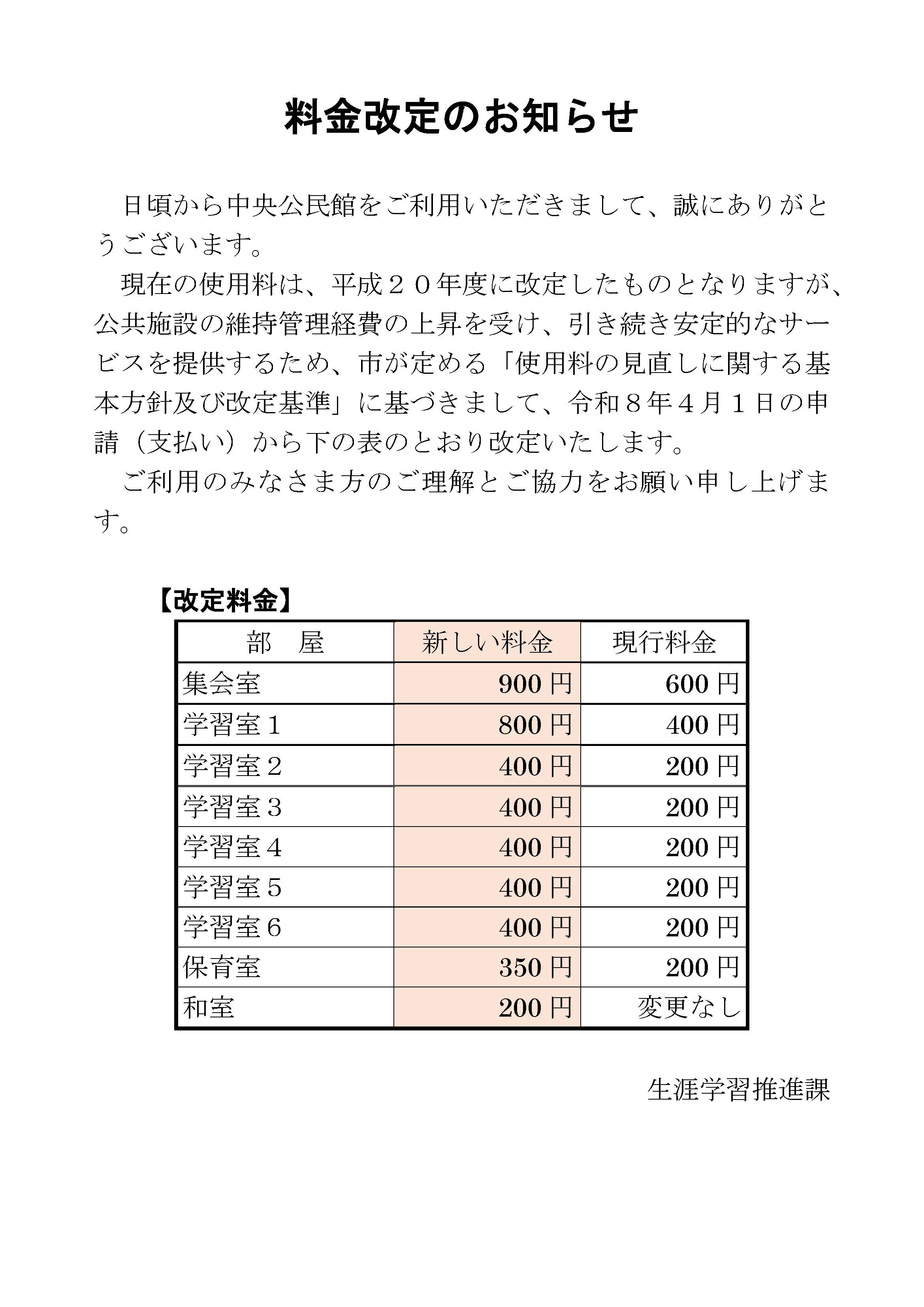 2025年12月24日更新 中央公民館施設使用料金改定のお知らせについて