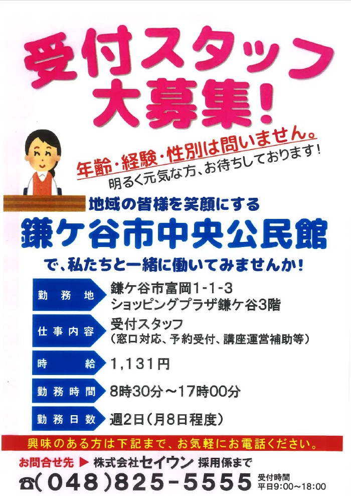 2024年11月09日更新 鎌ケ谷市中央公民館受付スタッフ大募集!