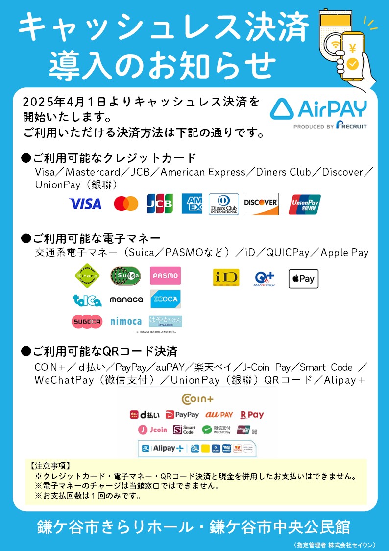 利用できるキャッシュレス決済の種類については、添付のチラシのとおりですが、詳しくは、中央公民館に問い合わせください。